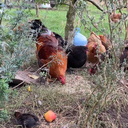 Vi vil gerne ærlige og sunde fødevarer. Derfor vil vi dyrke og lave vores egen mad efter økologiske og permakulturelle principper. Vi har høns, der holder æbleplantagen og giver os æg.